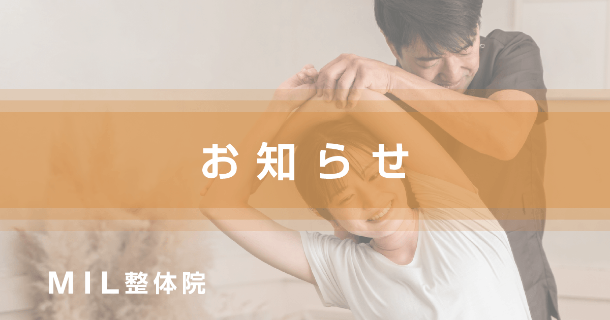 日頃よりMIL整体院をご愛顧いただき、誠にありがとうございます。 年末年始の営業日程についてご案内いたします。 年末年始のお休み 12月29日(日)〜1月5日(日) 本年... -